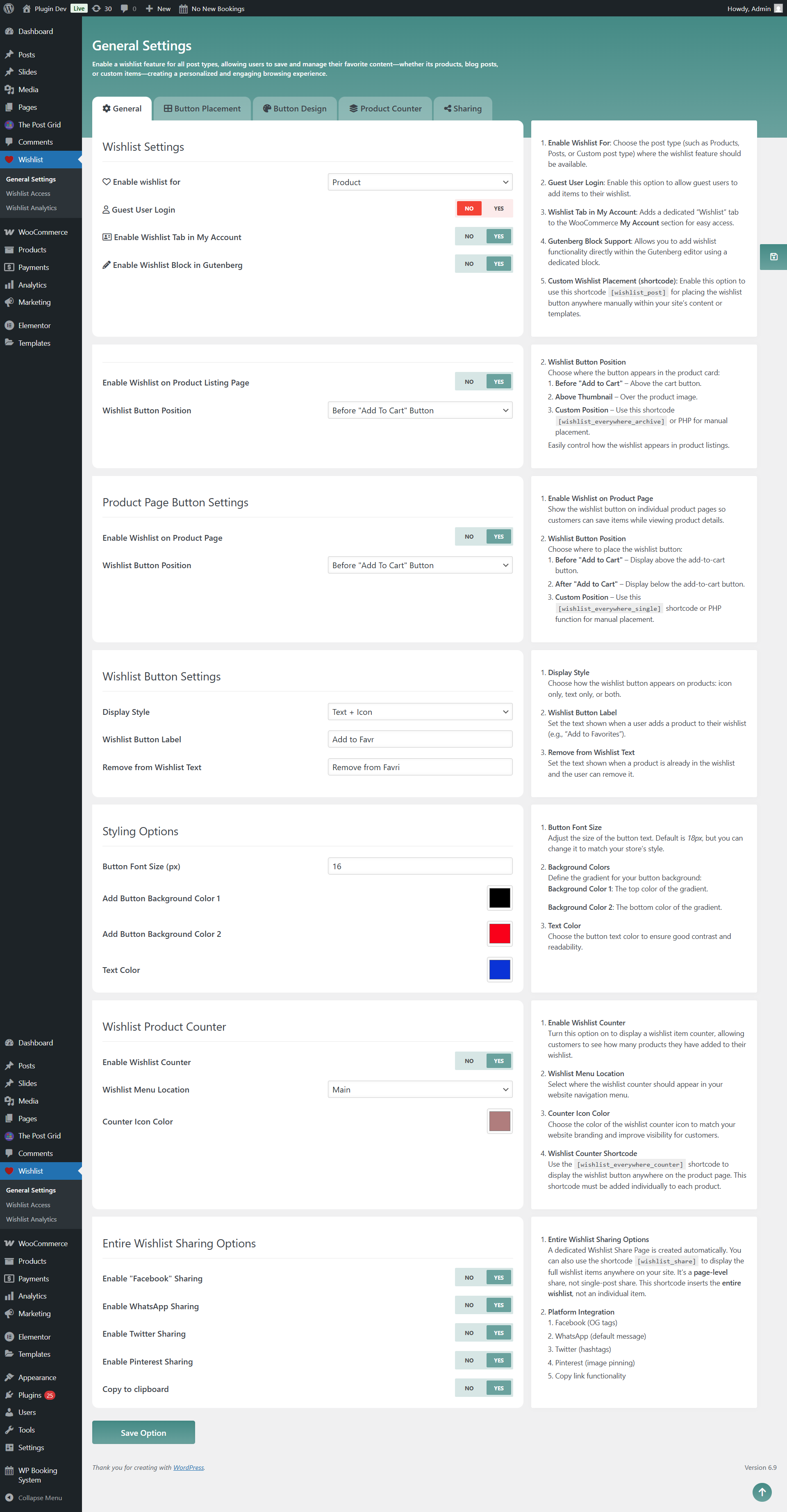 Detailed view of the wishlist settings page in the admin dashboard.