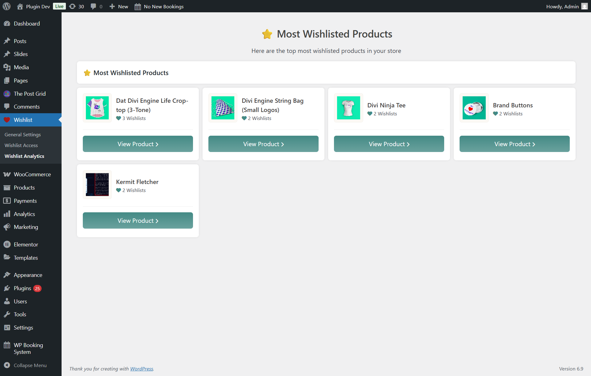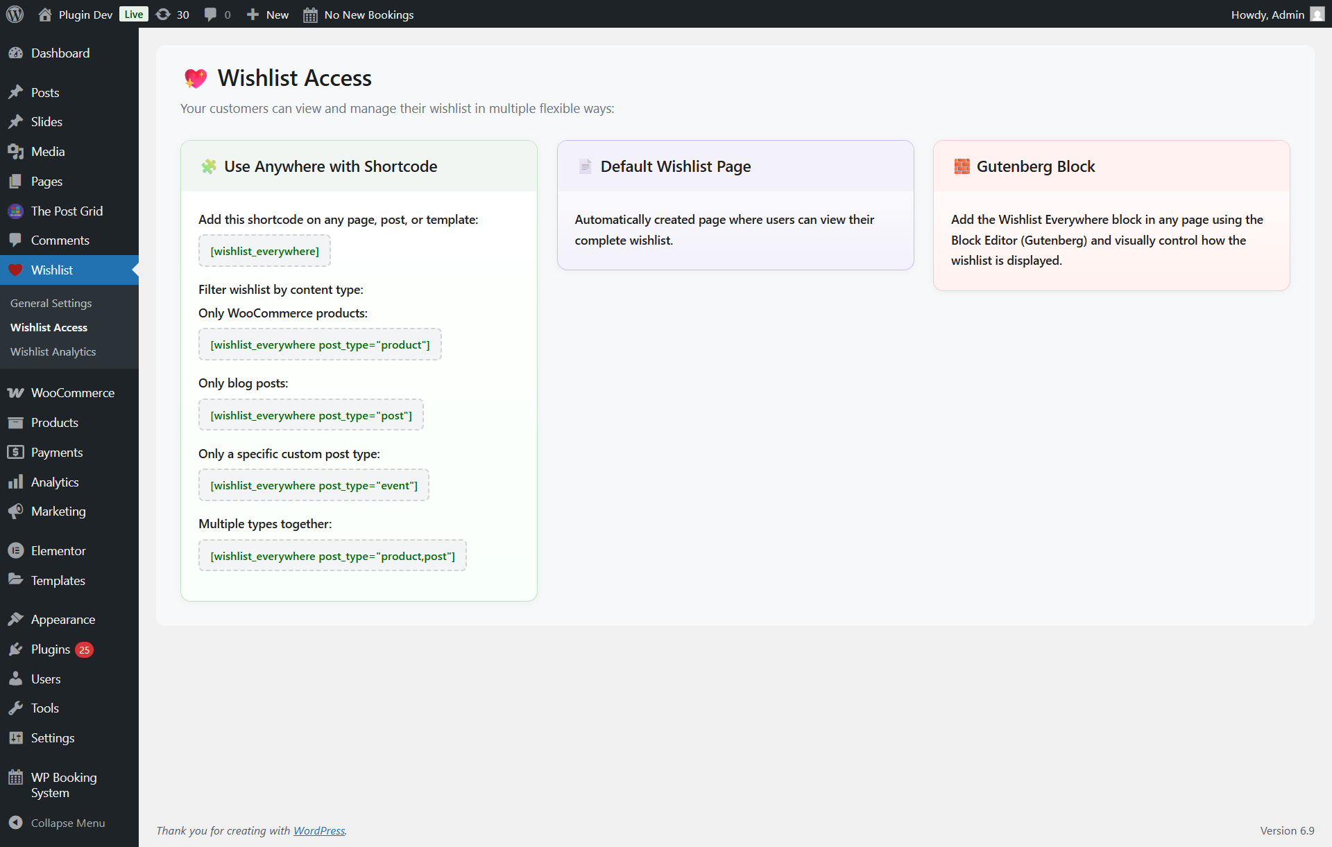 [wishlist_everywhere]to any page where you want the wishlist to appear. - Visit Dashboard Wihlist Everywhere Wishlist Analytics to see insights.
